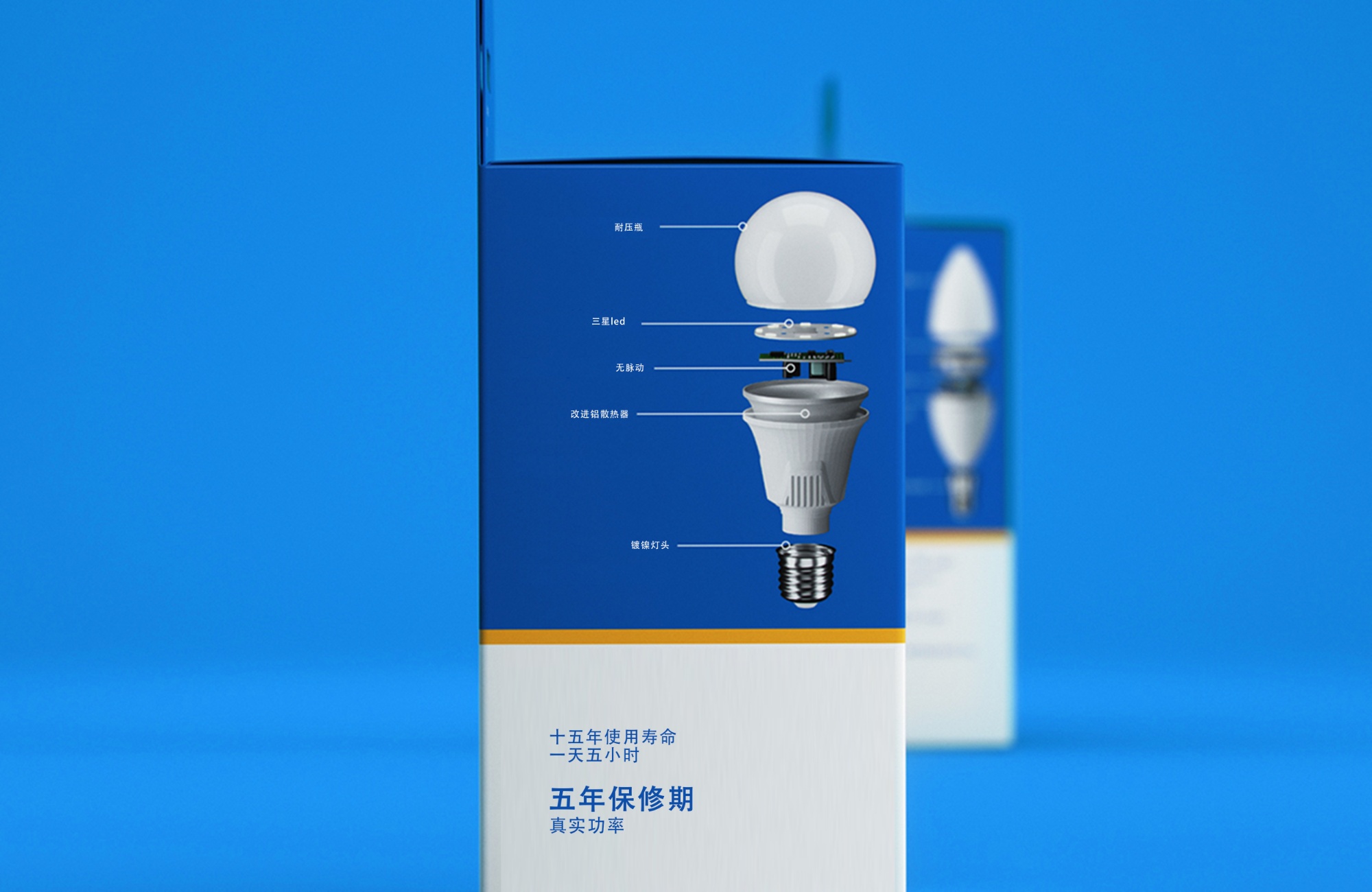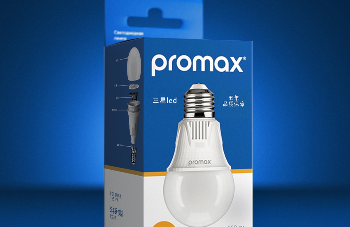 包裝上白色和藍(lán)色的組合說明了照明和非照明空間之間的邊界。它通過散熱器和燈泡之間。線的顏色和正面的小圓圈表示溫度為輕冷或暖。