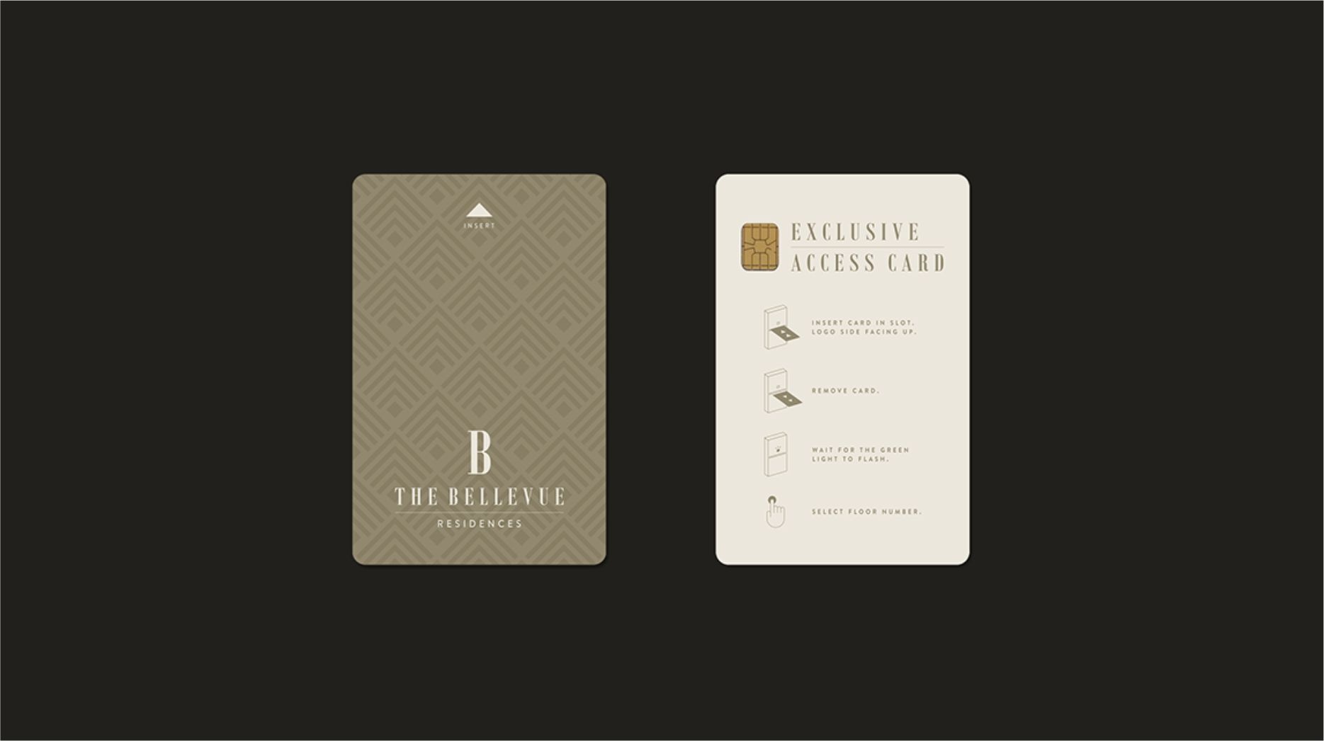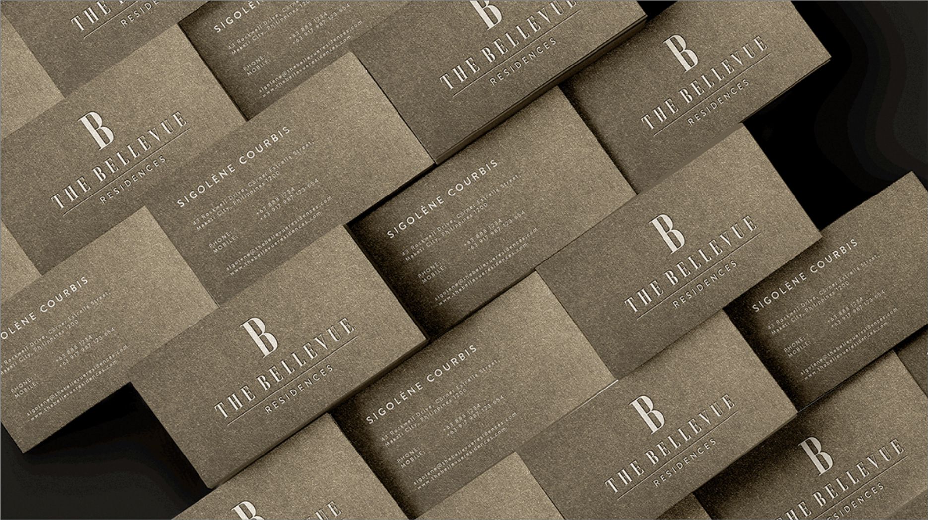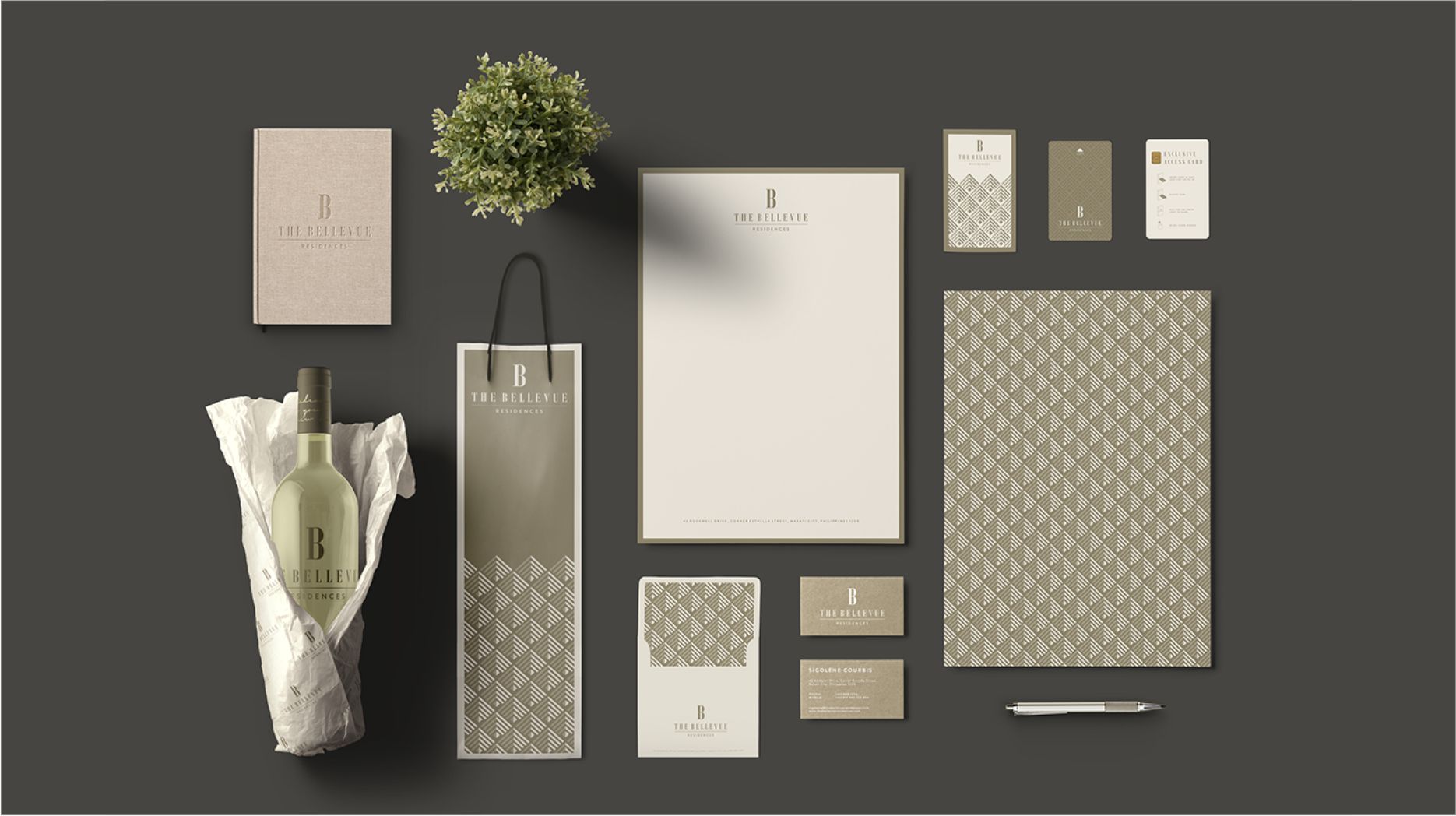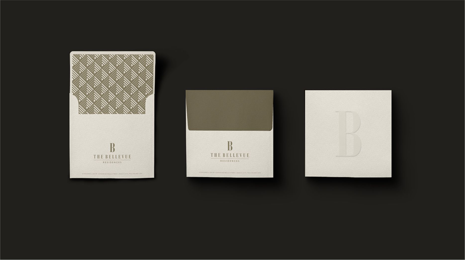 LOGO:這是一個簡潔而有力的設計,使用了一個襯線字體的大寫字母“B”,下面寫著“THE BELLEVUE”和“RESIDENCES”。LOGO的顏色采取暗金色,與酒店的整體風格相呼應,也象征著貴族和尊貴的氛圍。LOGO的整體形狀,給人一種穩(wěn)定和平衡的印象,也適合在各種媒介上使用。